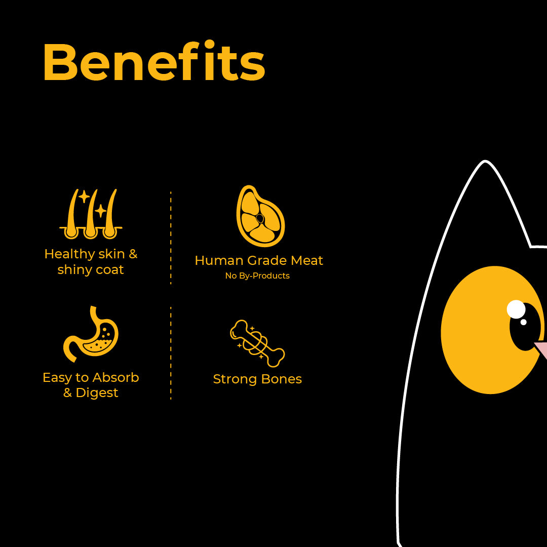 The Purrkins Adult Chicken Meal has 80% meat, 11% broth, and a 7% mix of potato & pumpkin puree. It’s a powerhouse of real meat for your cat when compared to a bowl of meal they usually have. [2x meat = 2x protein!]